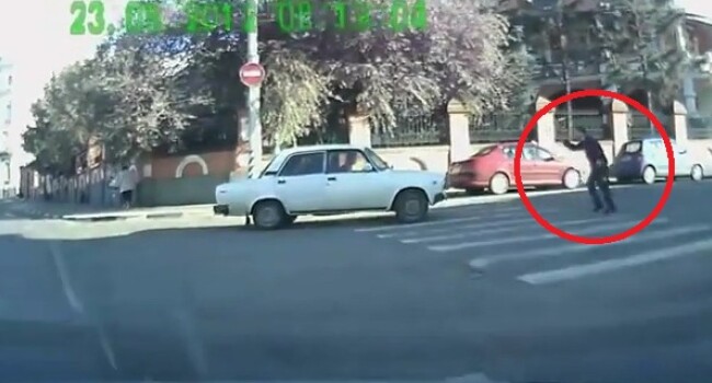 la un pas sa fie lovit de o masina.Pietonul nu a ramas fara reactie.